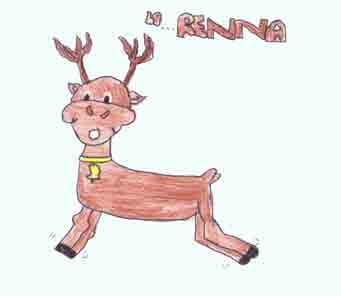 La renna è un animale speciale, infatti è il prescelto da Babbo Natale. Sa volare anche se non ha le ali. Tra poco andrà in pensione a causa del suo fortissimo mal di schiena che le è venuto a forza di portar regali. La renna e il cervo si sposano e i loro cuccioli stanno tutto il giorno a “incornarsi”. La renna è anche un animale molto vanitoso perché è famoso e sta tutto il giorno davanti allo specchio.