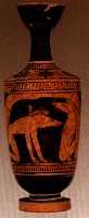 Lekythos attica a figure rosse della bottega del Pittore di Bowdoin. Due compagni di Ulisse trasformati da Circe in porci. Da Eretria, 480-470 a.C.